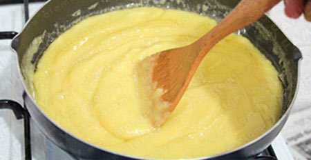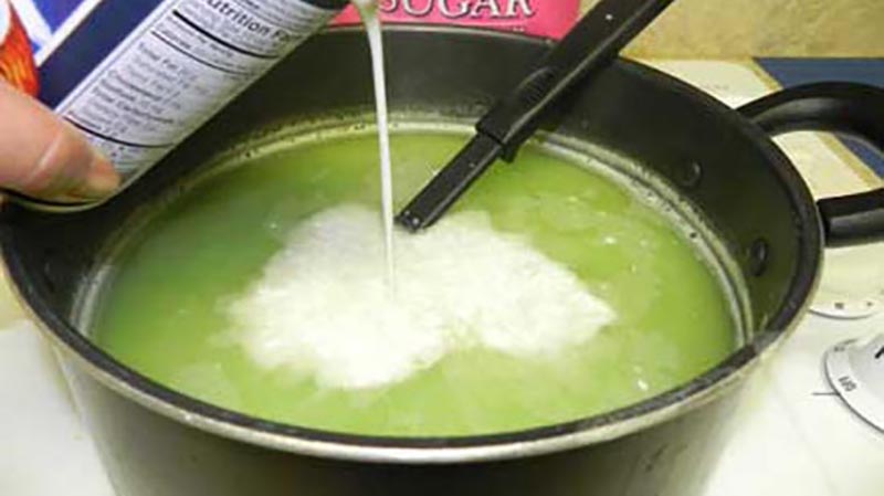 Bước 2: Cho sữa tươi vào nồi, thêm đường và cho đậu đã xay mịn vào khuấy đều, bật bếp lửa nhỏ vừa sau đó vừa nấu vừa khuấy để đậu không bị dính đáy nồi.