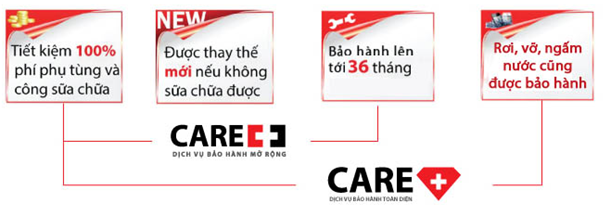 Đặc biệt, với gói bảo hành Care +, thời gian bảo hành sẽ không phải là 12 tháng như thông thường mà lên đến 36 tháng. Không chỉ vậy, điện thoại của bạn vẫn được bảo vệ ngay cả trong trường hợp bị rơi, vỡ,ngấm nước với gói Care + Diamond. Trong thời gian bảo hành, khách hàng sẽ được miễn phí 100\% chi phí phụ tùng và công sửa chữa. Nếu lỗi không thể khắc phục được, khách hàng sẽ được nhận lại ngay một điện thoạimới 100\% cùng model.