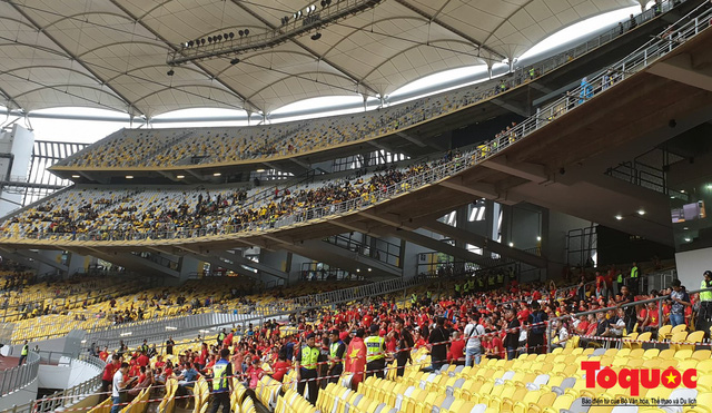 Tại khu vực khán đài E của sân vận động Bukit Jalil CĐV Việt Nam đã ngồi kín chỗ. Khu vực này được BTC bố trí dành riêng cho CĐV Việt Nam. Theo BTC, lực lượng an ninh sẽ được bố trí để đảm bảo an toàn cho CĐV Việt Nam. Ảnh: Tổ Quốc |