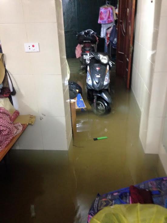 Nước tràn vào nhà dân ngập nửa bánh xe. |