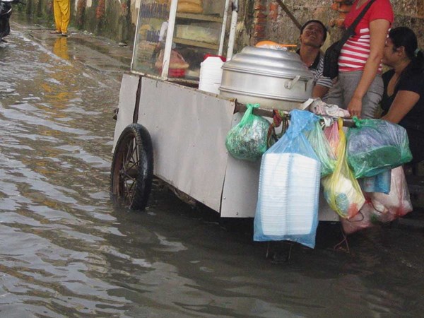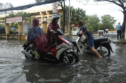 | Nhiều xe chết máy, người dân phải lội nước dắt xe. |