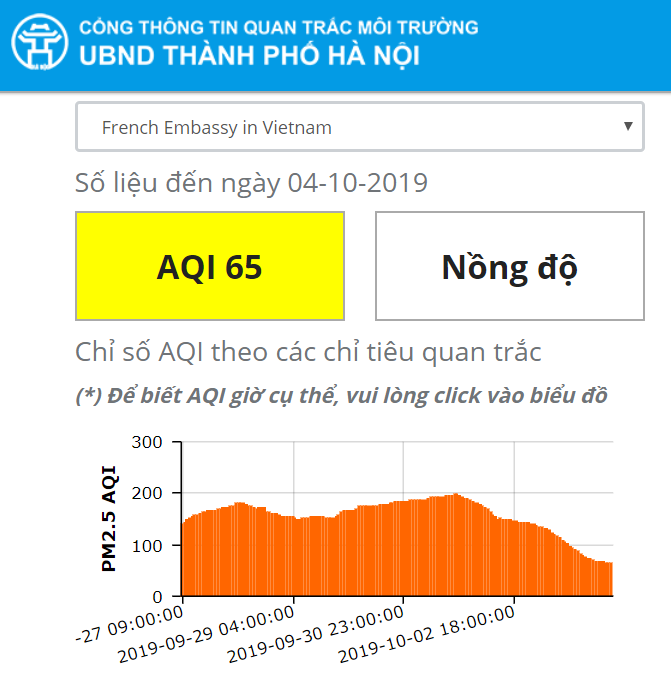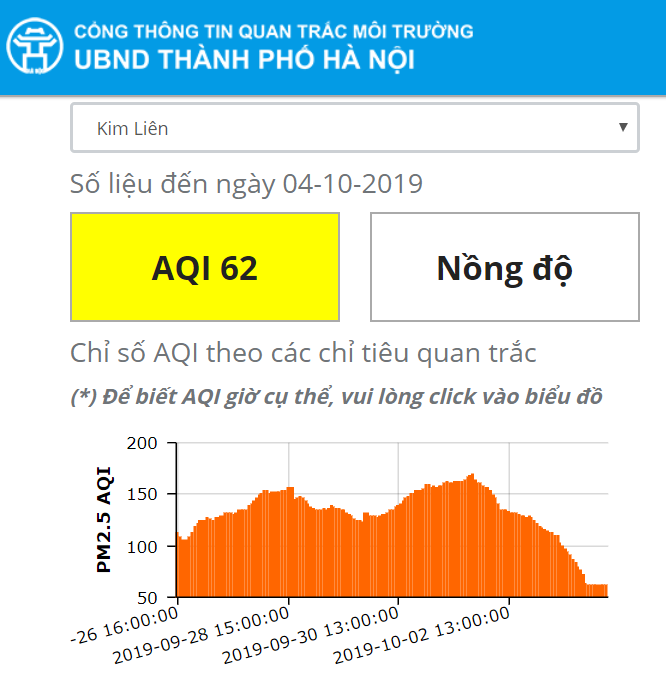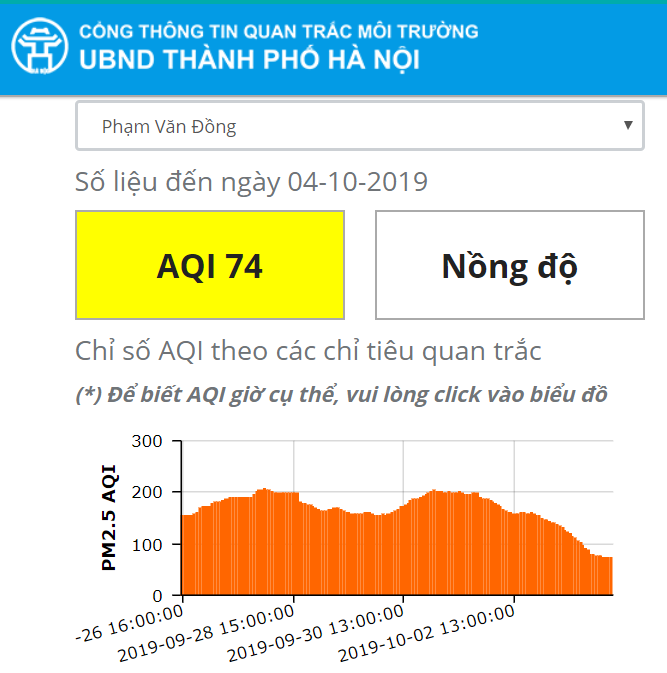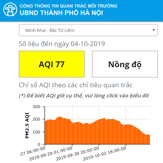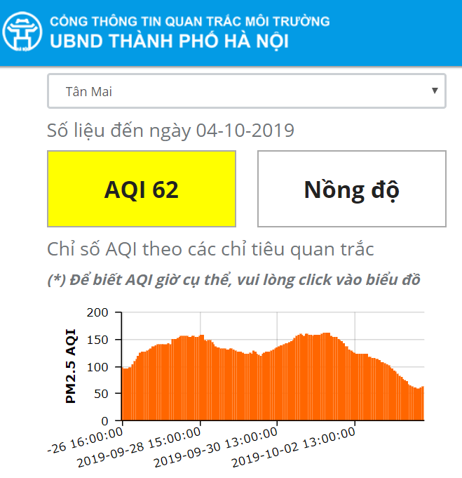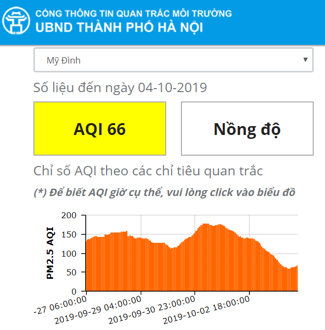 Cũng tương tự như các địa điểm khác, chỉ số AQI tại khu vực Mỹ Đình cũng giảm xuống ngưỡng 66. Trong khi ngày hôm qua (3/10) là 104. |