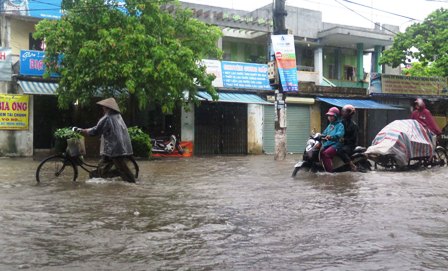 Đến thời điểm trưa nay, tình trạng ngập lụt tại các tuyến phố này đã khiến cho nhiều loại phương tiện lưu thông hết sức khó khăn. Việc ngập, ùn ứ nước trên các tuyến phố cũng khiến cuộc sống của hàng trăm hộ dân bị đảo lộn. Đặc biệt, tại tuyến phố Lê Quý Đôn, nơi được cho là “rốn ngập” của thành phố Thái Bình, đỉnh điểm có lúc mức nước tại con phố này lên đến 0,5m.