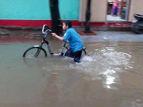 Nước ngập sâu tại tuyên phố đường Hồ Tùng Mậu, Trường Chinh…, TP Huế khiến người dân không đi lại khó khăn. |
