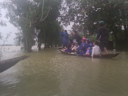 Nước lũ ngập sâu khiến người dân huyện Quảng Điền phải đi lại bằng ghe thuyền. |