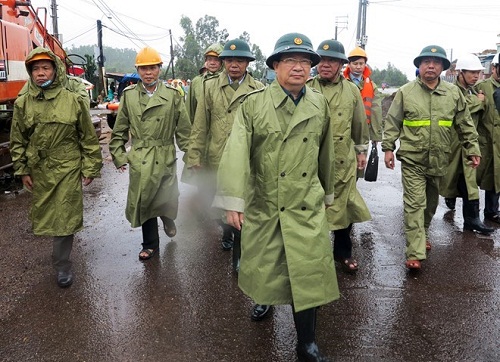 Phó Thủ tướng Trịnh Đình Dũng cùng lãnh đạo các Bộ, ngành về kiểm tra tình hình phòng chống mưa lũ tại Bình Định. Ảnh: Tri thức trực tuyến. |