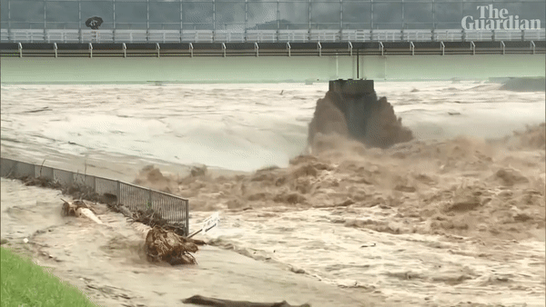 Dòng lũ trên sông Kuma ở tỉnh Kumamoto tràn bờ. Ảnh: The Guardian |