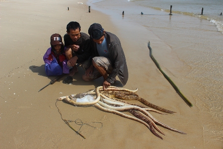 Từ tờ mờ sáng, anh Trần Văn Hải ở thôn Hà Tây xã Triệu An, huyện Triệu Phong (Quảng Trị) gọi điện thoại giục tôi có mặt tại nhà anh gấp để xuống biển săn “thuồng luồng” biển. Dụng cụ để săn “thuồng luồng” biển đơn giản chỉ là đoạn tre có chiều dài khoảng 1,7m (to cỡ cổ tay người lớn) với một đầu đoạn tre được gia cố thêm 3 đoạn thép mài nhọn, có ngạnh mà người săn “thuồng luồng” thường gọi là cây “xỉa” cùng chiếc kính đeo mắt tự chế để có thể nhìn thấy mọi vật khi lặn xuống biển. Tôi cùng anh Hải xuống đến bờ cũng là lúc mặt trời đỏ lừ từ từ nhô lên khỏi mặt biển. Anh Hải bảo tôi ngồi nghỉ vài phút cho bớt mệt sau đoạn đường băng qua mấy đồi cát trắng và cũng để chờ thêm hai người bạn anh trước khi xuống biển săn “thuồng luồng”.