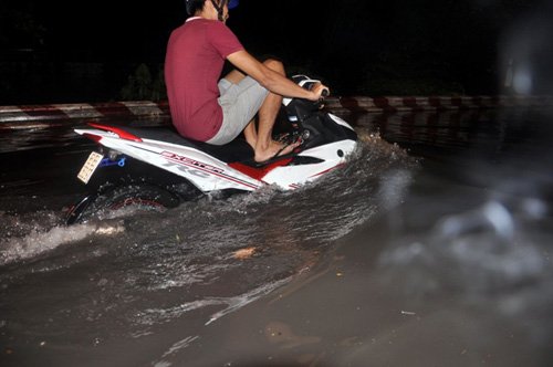 Nhiều người cố chạy xe qua đoạn đường ngập nước bị lạc tay lái té sõng xoài xuống làn nước đen ngòm. Số khác quay đầu xe tìm hướng khác để đi. Trong khi đó những người có nhà trong khu nước ngập đành chờ nước rút hoặc dẫn bộ xe về nhà.