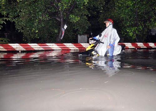Phải đến 21h30 khu vực đường Tô Hiệu, Trần Quang Cơ nước vẫn còn ngập trên đầu gối.