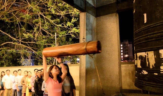 Hàng trăm người dân xếp hàng thỉnh chuông chùa Vĩnh Nghiêm tại TP HCM. Lễ thỉnh chuông được chùa Vĩnh Nghiêm cho khách thập phương thực hiện để lấy lộc đầu năm vào giao thừa vài năm gần đây.