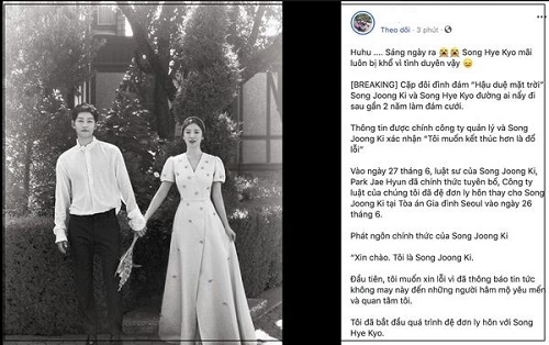 "Tôi đã quyết định bắt đầu quá trình dàn xếp của tòa án cho việc ly hôn Song Hye Kyo. Tôi rất tiếc khi phải tiết lộ tin buồn này với những ai yêu mến và ủng hộ tôi", tài tử Song Joong Ki nói thông qua Blossom Entertainment, công ty quản lý của anh.