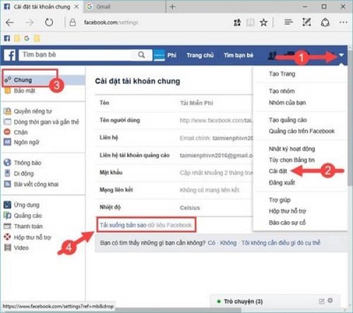 Bước 1: Bấm vào biểu tượng mũi tên, chọn “Cài đặt” –> “Chung” rồi lựa chọn “Tải xuống bản sao dữ liệu Facebook”như hình dưới.