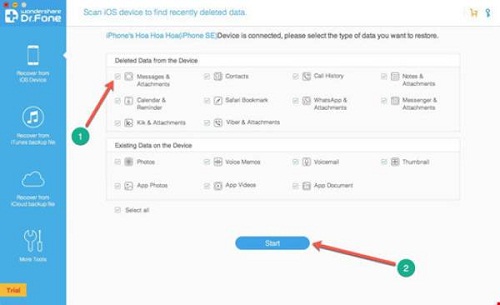 Bước 3: Lựa chọn các mục cần khôi phục như Messages & Attachments, Contacts (Danh bạ), Call History (Lịch sử cuộc gọi), Photos (Hình ảnh), App Document (Tài liệu)… Sau đó nhấn “Start” và chờ một lát để ứng dụng quét qua toàn bộ thiết bị.