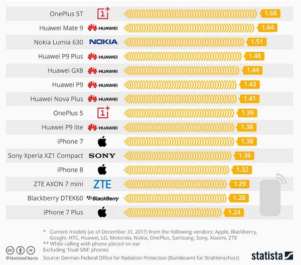 Tháng 1/2018, Văn phòng Bảo vệ bức xạ của Liên bang Đức vừa công bố danh sách này sau nhiều tháng tiến hành thí nghiệm đo lượng bức xạ của các mẫu điện thoại thông minh phổ biến trên thị trường.