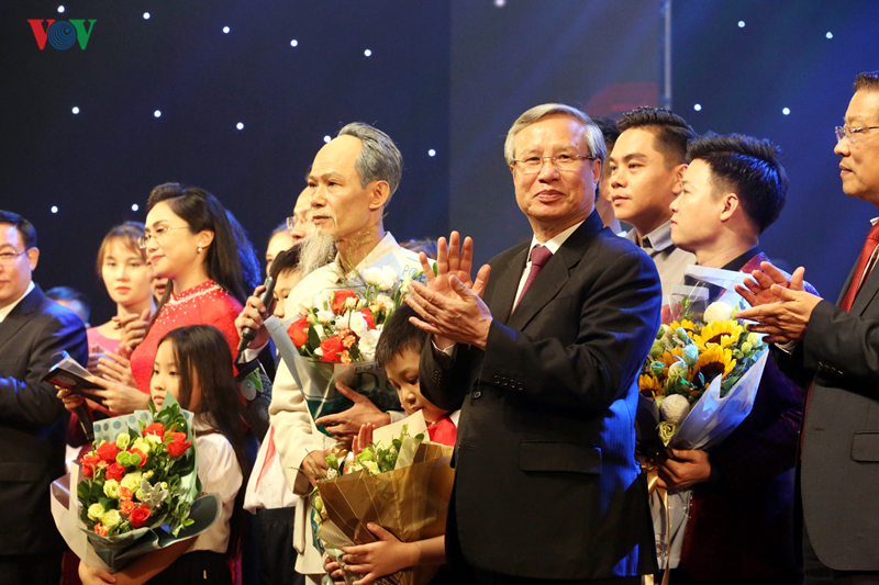 Ông Trần Quốc Vượng, Ủy viên Bộ Chính trị, Thường trực Ban Bí thư lên tặng hoa và chúc mừng các nghệ sĩ. |