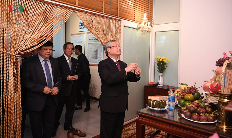 Tại bàn thờ Bác Hồ trong không gian Phòng truyền thống của Đài Tiếng nói Việt Nam, Thường trực Ban Bí thư Trần Quốc Vượng cùng các lãnh đạo thắp hương tưởng nhớ Chủ tịch Hồ Chí Minh. |