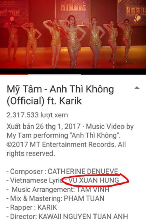 Nhạc sĩ Vũ Xuân Hùng bức xúc vì phía Mỹ Tâm không hề gọi điện xin phép nhạc sĩ, không chú thích đầy đủ mà chỉ ghi chung chung là nhạc Pháp, lời Việt.