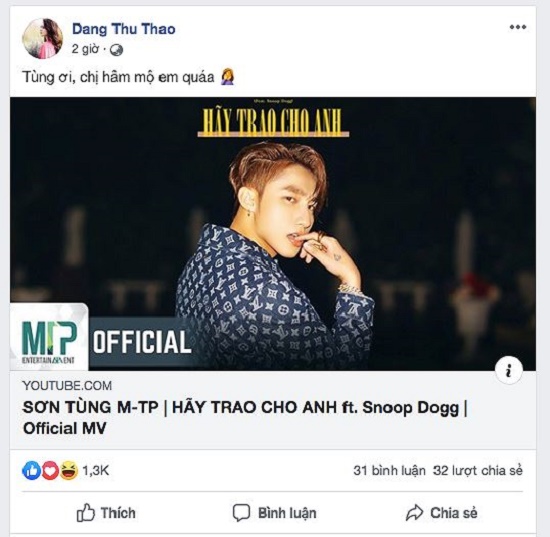 Minh Tú chia sẻ MV "Hãy trao cho anh" lên trang cá nhân của mình với những lời khen "có cánh" dành cho Sơn Tùng M-TP. Ảnh: Tiền Phong |