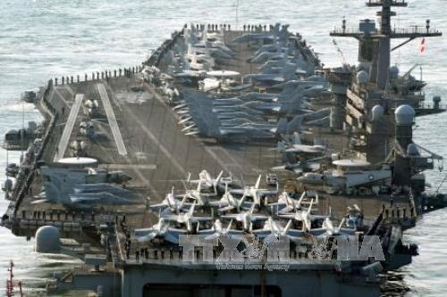 Tàu sân bay USS Carl Vinson của Hải quân Mỹ tới cảng Busan, Hàn Quốc. (Ảnh: Kyodo/TTXVN) |