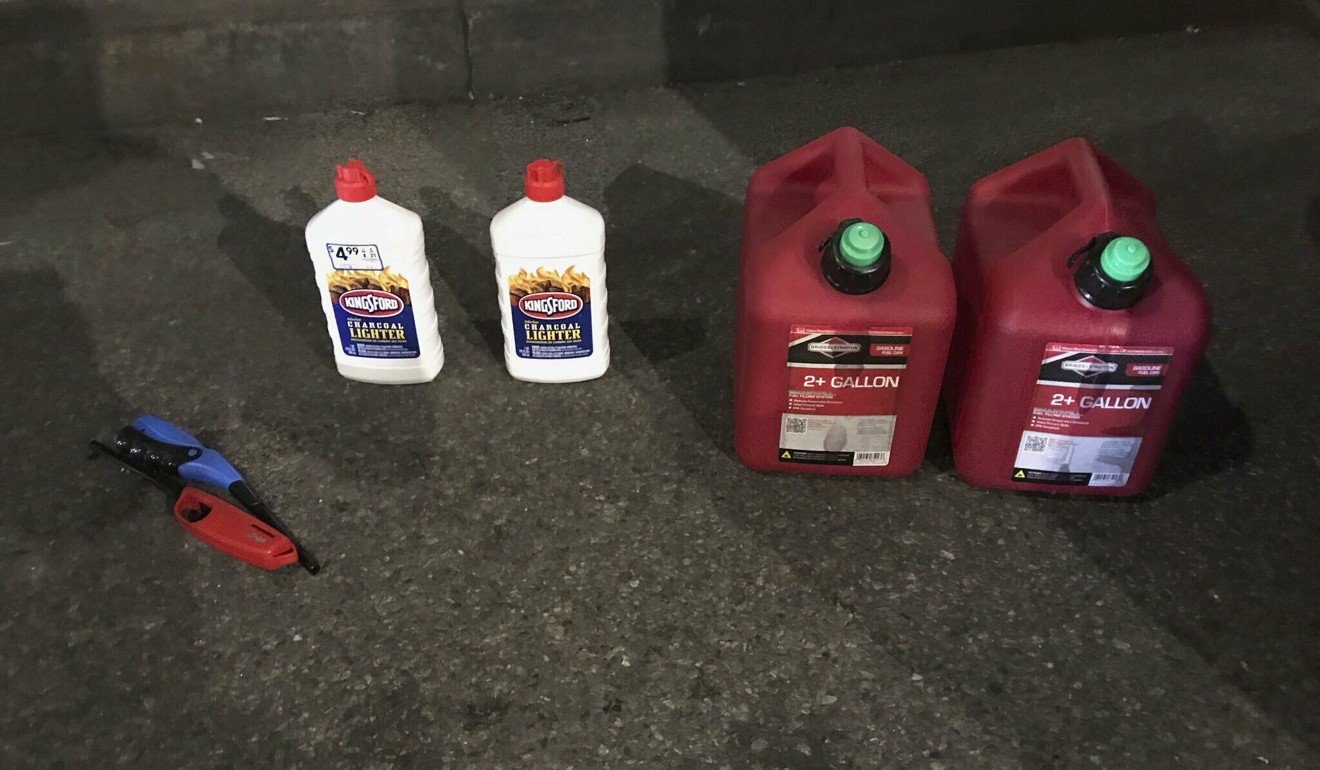 Tang vật cảnh sát thu được bao gồm: 2 thùng chứa xăng, 2 chai xăng nhẹ và 2 bật lửa khò, ngày 17/4 tại New York. Ảnh: AP |
