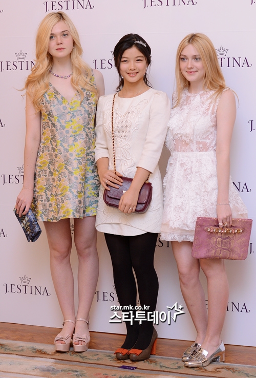 | Kim Yoo Jung như lọt thỏm khi đứng giữa chị em diễn viên người Mỹ - Dakota và Elle Fanning. |