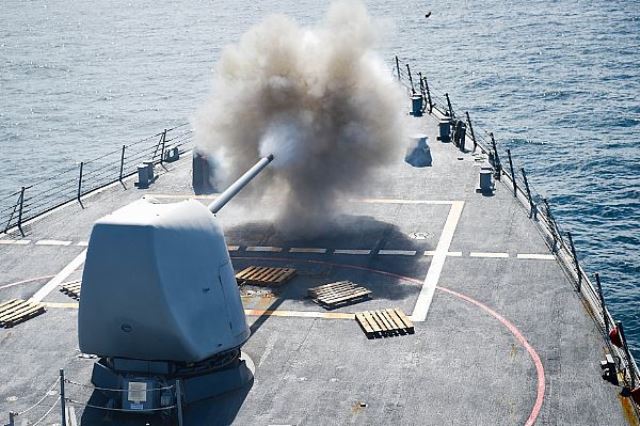 Tàu khu trục Mỹ USS Stethem dội hỏa lực vào mục tiêu trên biển trong diễn tập CARAT 2016 ở Biển Đông. Ảnh: US Navy |