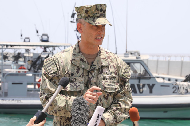 Chỉ huy Lực lượng Hải quân của Bộ Tư lệnh Trung tâm Mỹ Sean Kido phát biểu trong buổi họp báo. Ảnh: Getty |