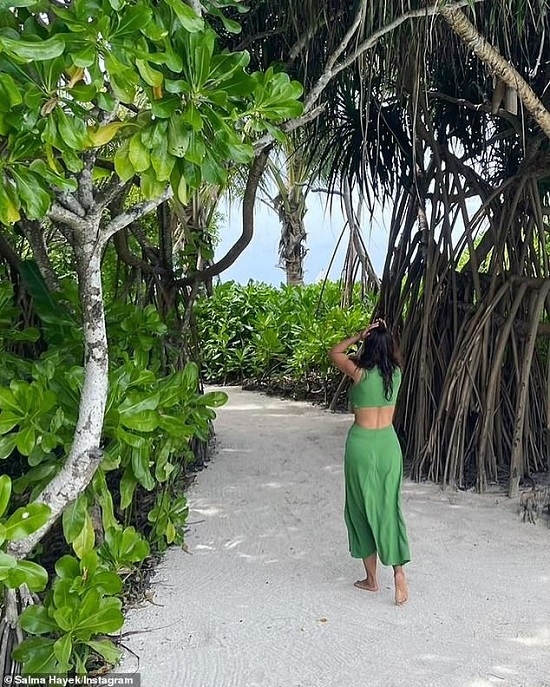 Mỹ nhân gợi cảm Salma Hayek khoe đường cong gợi cảm trong chiếc váy xanh xẻ tà để ăn mừng tài khoản Instagram của cô đạt 17 triệu người theo dõi.