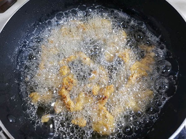 Đổ dầu vào chảo với lượng thích hợp để có thể chiên ngập dầu. Gắp từng miếng thịt đã đẫm bột vào chảo, chiên trên lửa vừa đến khi vàng đều cả 2 mặt.