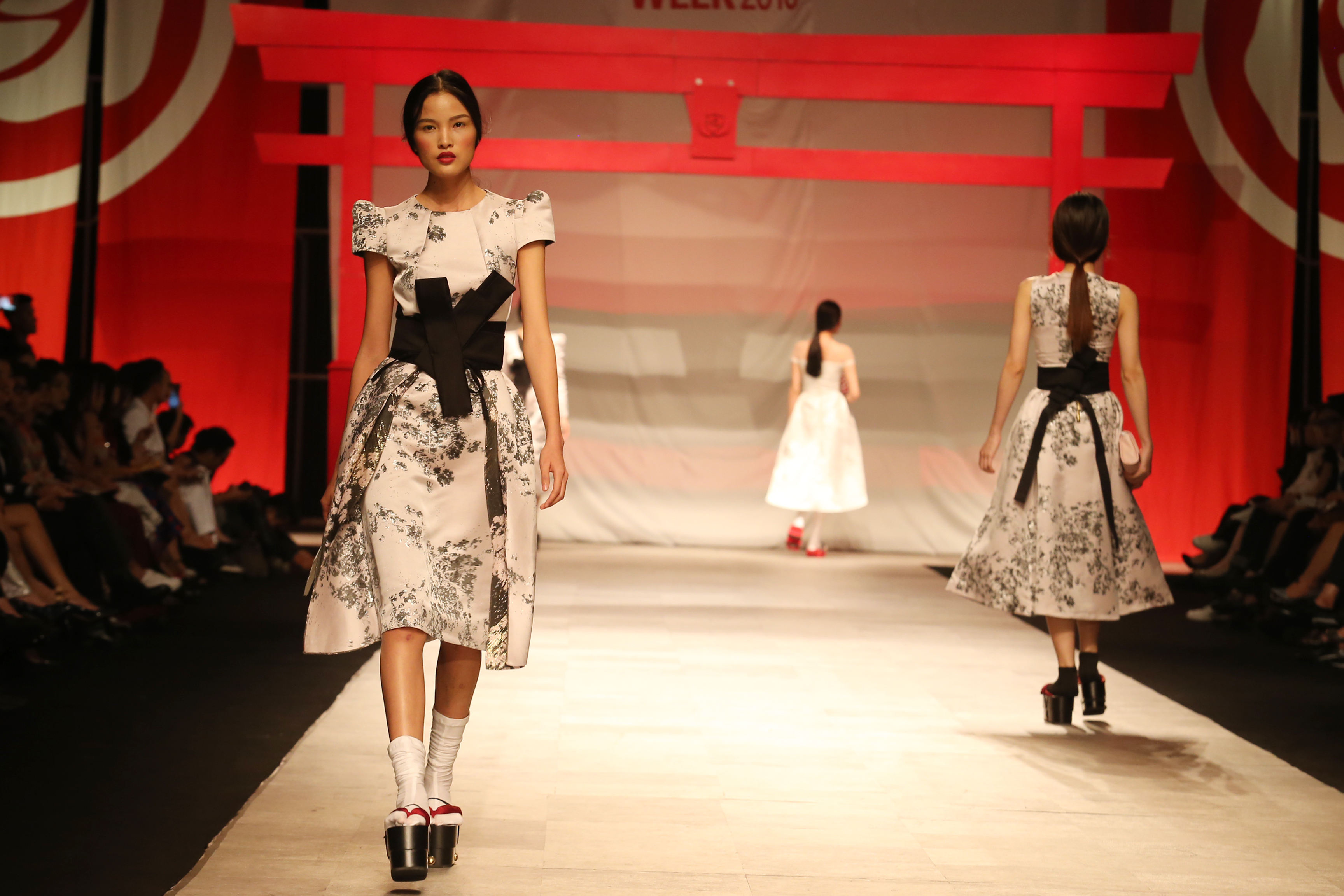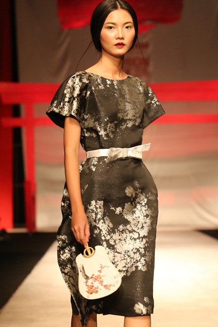 Vải lưới mỏng manh dành cho đầm dạ hội, vải tơ tằm dệt chìm họa tiết hoa anh đào, vải dạ dập nổi họa tiết nước, vải pha tơ tằm và dạ tạo nên hiệu ứng chìm, nổi của họa tiết lá. Toàn bộ chất liệu được dệt tại nhà máy trước khi thiết kế và cắt.