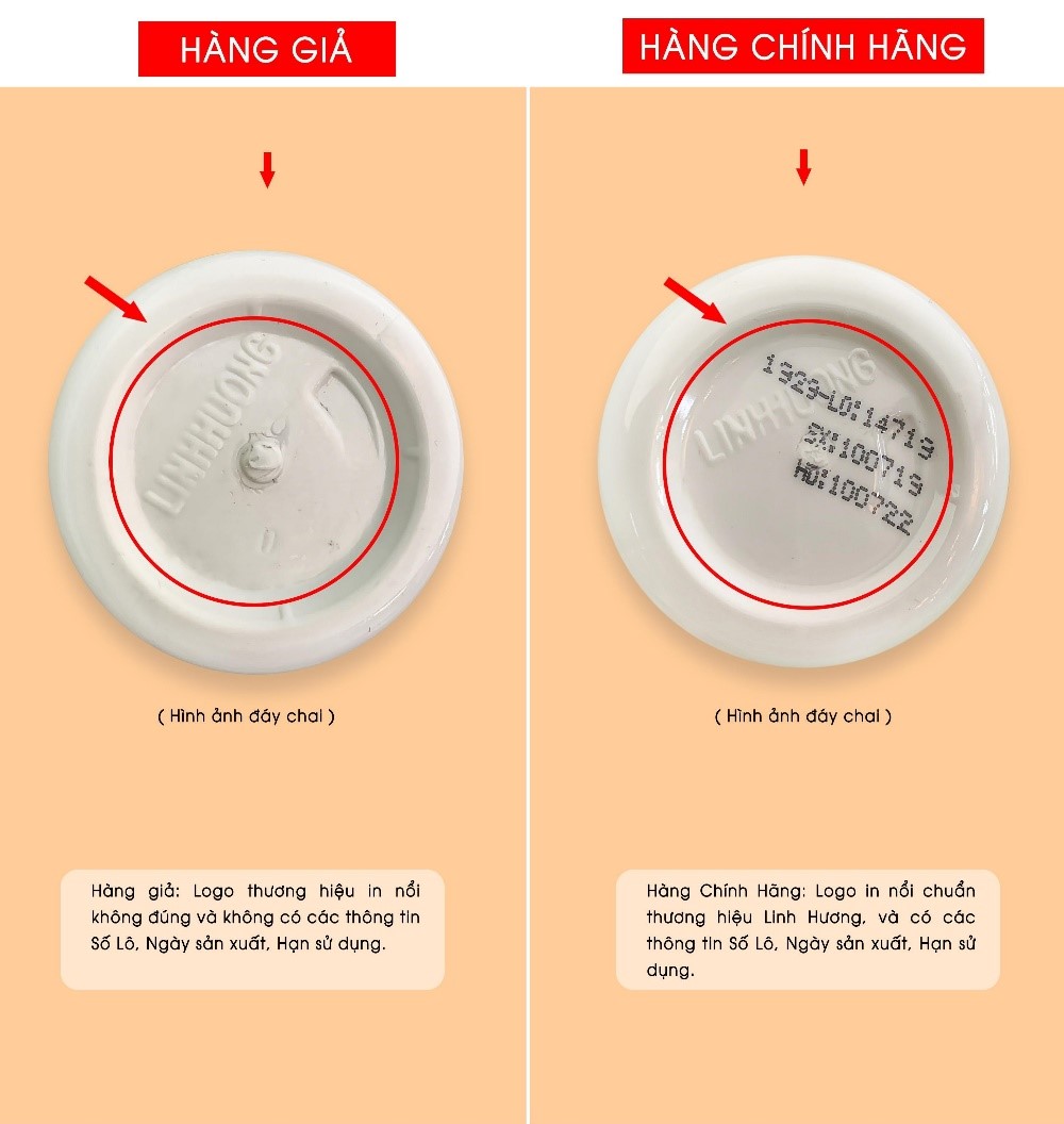 Sự khác biệt ở đáy sản phẩm cũng là điểm mà bạn nên lưu ý khi mua hàng. Cả sản phẩm hàng giả lẫn sản phẩm chính hãng đều có in logo ở đáy chai nhưng chất lượng logo lại không có điểm tương đồng. Sản phẩm hàng giả có in logo to cũng như thừa nét chữ “ H” trong khi logo của sản phẩm chính hãng được in nổi thuẩn thương hiệu Linh Hương.