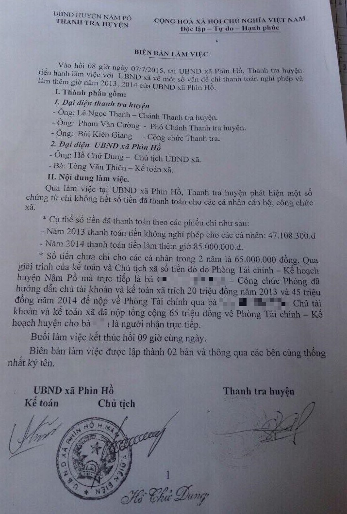 Kết quả Thanh tra thể hiện Chủ tịch và kế toán các xã thừa nhận số tiền chưa chi hết được chuyển về Phòng Tài chính kế hoạch huyện Nậm Pồ. Sau đó, trực tiếp cán bộ công chức của Phòng Tài chính kế hoạch huyện đứng ra nhận đã nhận tiền chuyển từ Chủ tịch và kế toán xã. Cụ thể năm 2013 tổng số tiền nghỉ phép và làm thêm giờ của cán bộ, công chức của 4 xã đã chuyển cho Phòng Tài chính kế hoạch huyện là 125 triệu đồng và năm 2014 là 75 triệu đồng.