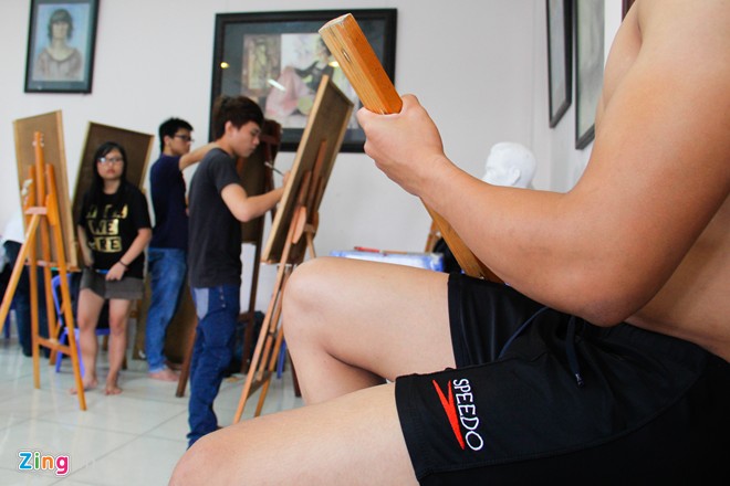 Duy và Nam là hai trong số nhiều chàng trai hàng ngày cởi trần ngồi không cử động cho các bạn trẻ luyện thi đại học tập vẽ chân dung tại lớp hội họa ở TP HCM.