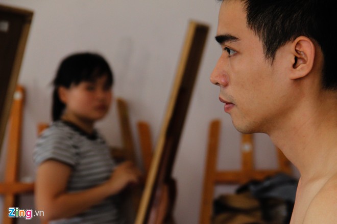 "Lần đầu tiên khi phải cởi đồ trước mặt mọi người, mình thấy rất ngại, huống chi còn bị các bạn nhìn chằm chằm để vẽ. Nhưng nhờ học cùng chuyên ngành nên mình hiểu và quen dần, về sau đỡ ngại hơn" - anh chia sẻ.