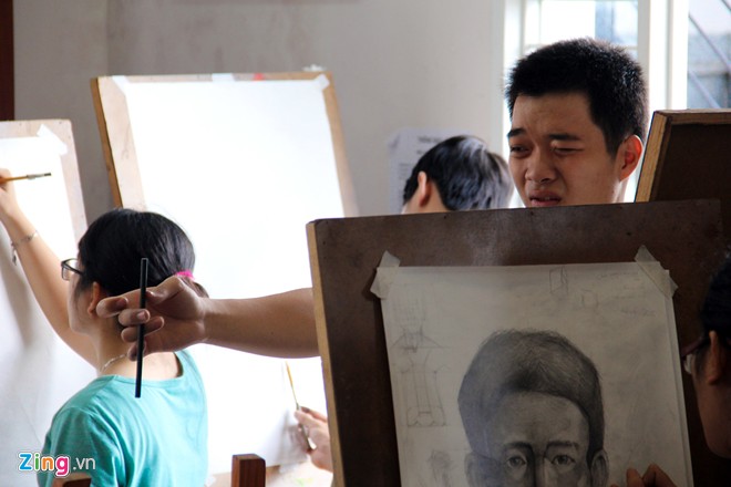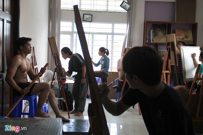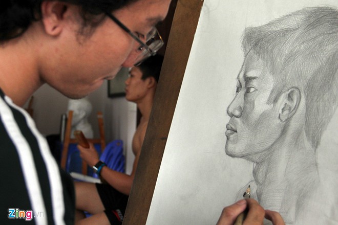 Ở một lớp luyện thi khác, Đặng Tiến An (sinh năm 1995) - sinh viên Khoa Mỹ thuật Công nghiệp - cũng chọn việc ngồi làm mẫu cho thí sinh luyện thi đại học để kiếm thêm thu nhập. |
