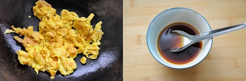Đập trứng vào bát đánh tan. Đun nóng một ít dầu ăn trong chảo, đổ trứng vào chiên cho trứng nở phồng lên rồi đánh tơi. Cho nước tương vào bát, thêm đường, dầu hào, muối vào trộn đều thành nước xốt.