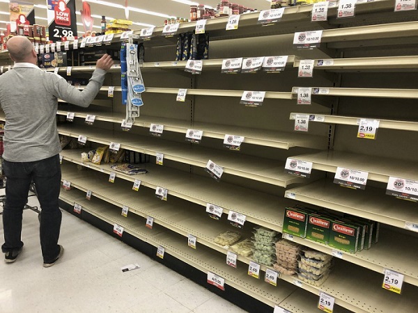 Những kệ hàng trống trơn tại siêu thị ở Mỹ. Ảnh: AP |