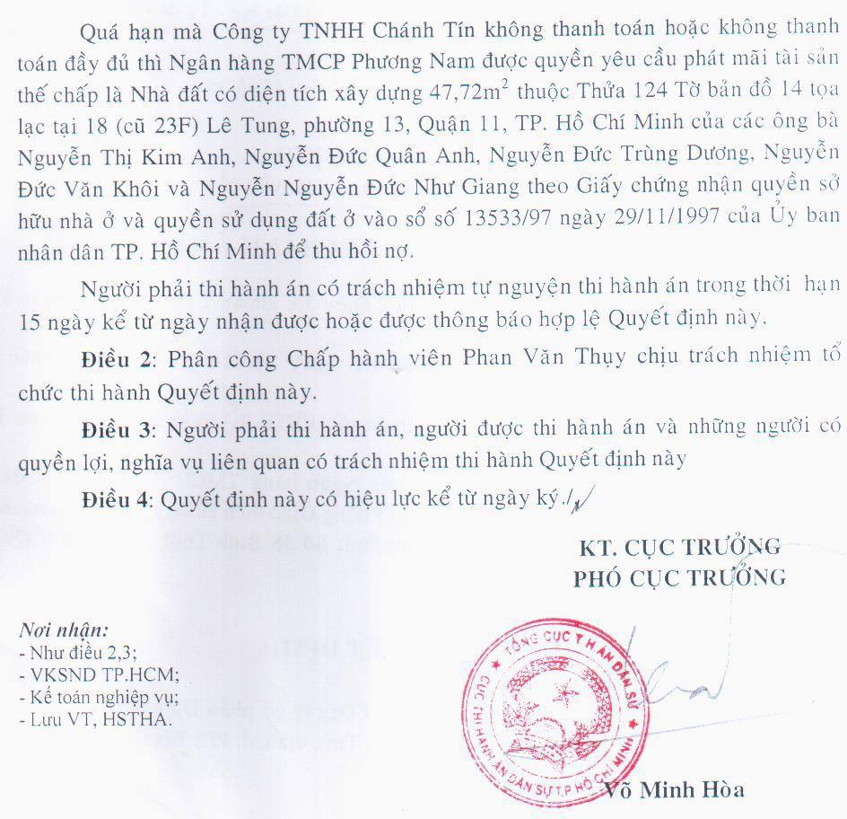 Trong bản scan Quyết định thi hành án được ông Quân Anh đăng tải trên trang cá nhân thì Cục Thi hành án Dân sự đã cho phép Ngân hàng Phương Nam phát mãi căn nhà thuộc sở hữu của gia đình ông - tài sản thế chấp để công ty Chánh Tín vay tiền - để thu hồi nợ.