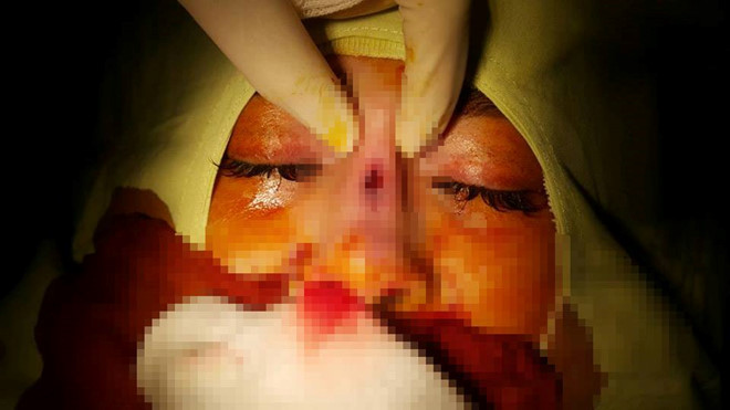 Nâng mũi giá rẻ tại một cơ sở làm đẹp không có uy tín, cô gái trẻ 29 tuổi bị silicon đâm thủng da ở vị trí giữa sống mũi dẫn đến hoại tử.