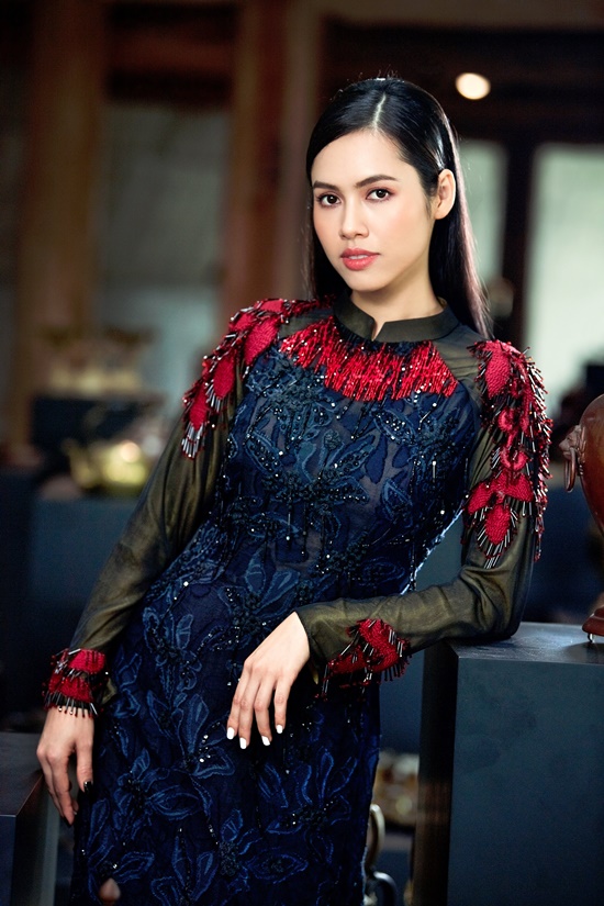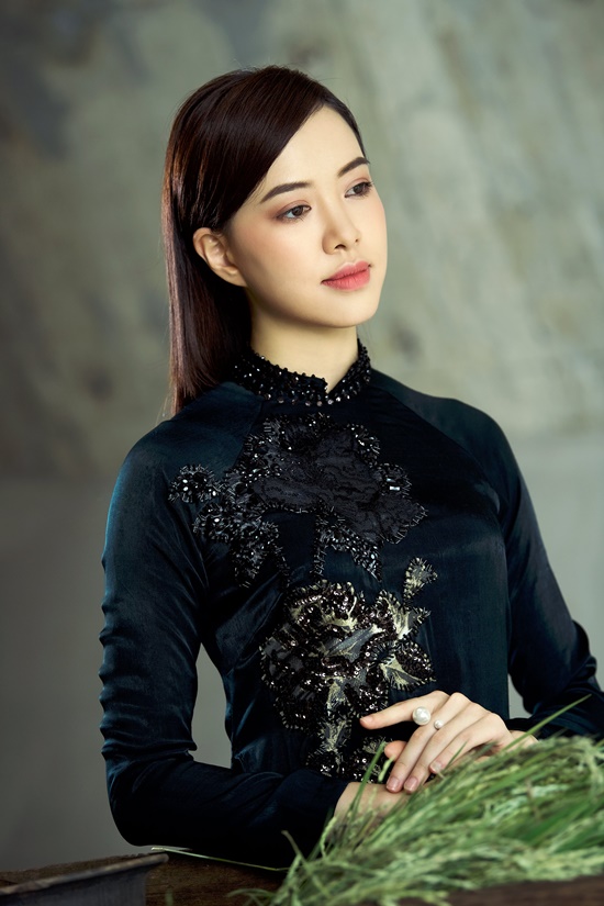 Trong tà áo dài, nhan sắc đậm chất Á Đông của Ngọc Trân càng nổi bật với vẻ đẹp tự nhiên cùng sống mũi cao, lông mày thanh tú, đôi mắt trong và mái tóc đen thẳng mượt.