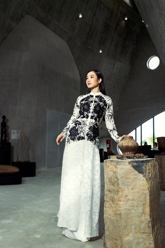 Trên chất liệu lụa tơ tằm, voan, organza phối cùng gấm, sợi dệt nhân tạo cùng kỹ thuật tạo khối 3D và đính kết thủ công, những thiết kế áo dài với hai gam màu trắng kem, đen cùng họa tiết, điểm nhấn đen, trắng... |