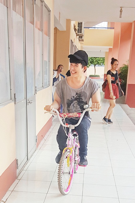 | Xuất hiện bụi bặm, phong trần, Nathan Lee lại khiến Hồ Quỳnh Hương cười ngất khi lái một chiếc xe đạp cho trẻ con màu hồng. |