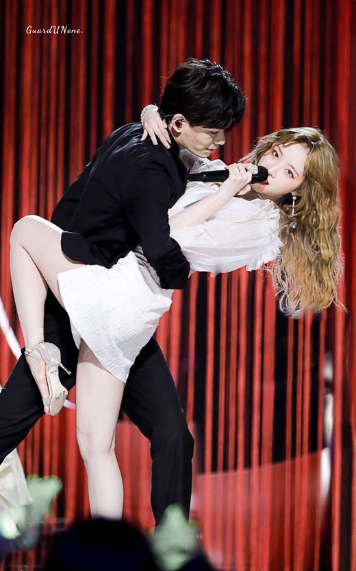 Trịnh Nãi Hinh đảm nhận vị trí center của màn trình diễn nên cô có nhiều tương tác nhất với Đinh Vũ Hề. |