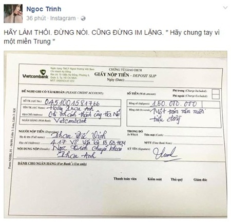 Chiều 17/10, Ngọc Trinh cũng công khai ủng hộ số tiền này vào tài khoản Phan Anh, chung tay giúp đỡ những người dân trong tâm bão.