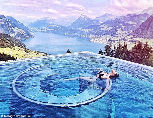 Siêu mẫu Ann Louie Li ngắm hoàng hôn khi thư giãn trong bể bơi vô cực nhìn xuống hồ Lucerne, Thụy Sĩ. |