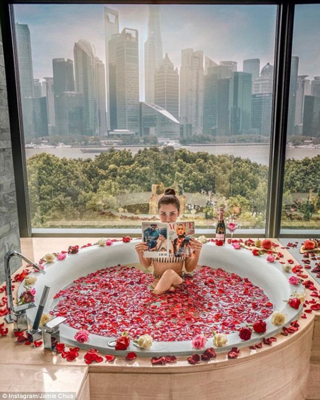 Jamie Chua chia sẻ trên mạng xã hội Instagram bức ảnh chụp cô tắm với cánh đồng hoa tại khách sạn Banyan Tree Shanghai on the Bund ở Thượng Hải, Trung Quốc. |