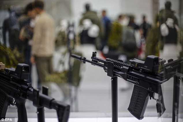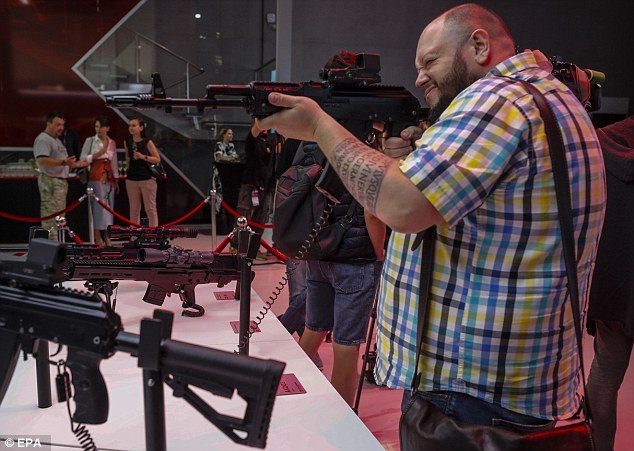 Một vị khách xem xét một khẩu súng trường AK-12 tại buổi triển lãm. - Ảnh: EPA |