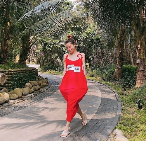 Mẫu váy "bao tải" được nhiều tín đồ thời trang lựa chọn cũng lọt vào "mắt xanh" của Hà Hồ, cô diện trong chuyến đi du lịch cùng người yêu tại Đà Nẵng. Chiếc váy "nổi bần bật" này khi được Hà Hồ diện vào lại càng nổi bật hơn với vóc dáng chuẩn của cô.