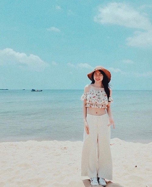 Khác với các mỹ nhân khác, Hòa Minzy có phong cách đi biển ấn tượng với áo croptop bèo nhún, quần ống rộng kết hợp cùng giày sneaker thêm một chiếc mũ.